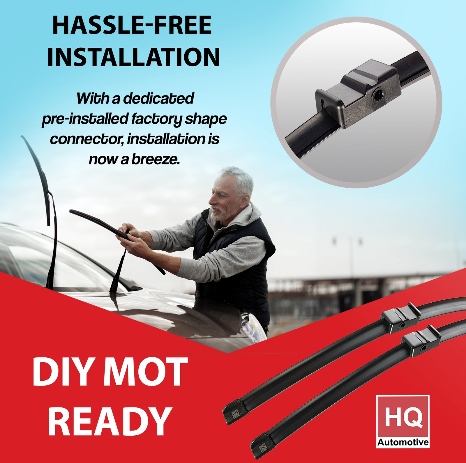 Zamontujesz je samodzielnie w kilka minut. System złącza Side-Pin sprawia, że jest to proces bez użycia narzędzi. Wystarczy wyjąć stare pióra i wcisnąć zamienniki HQ Automotive na miejsce — bez potrzeby stosowania adapterów.